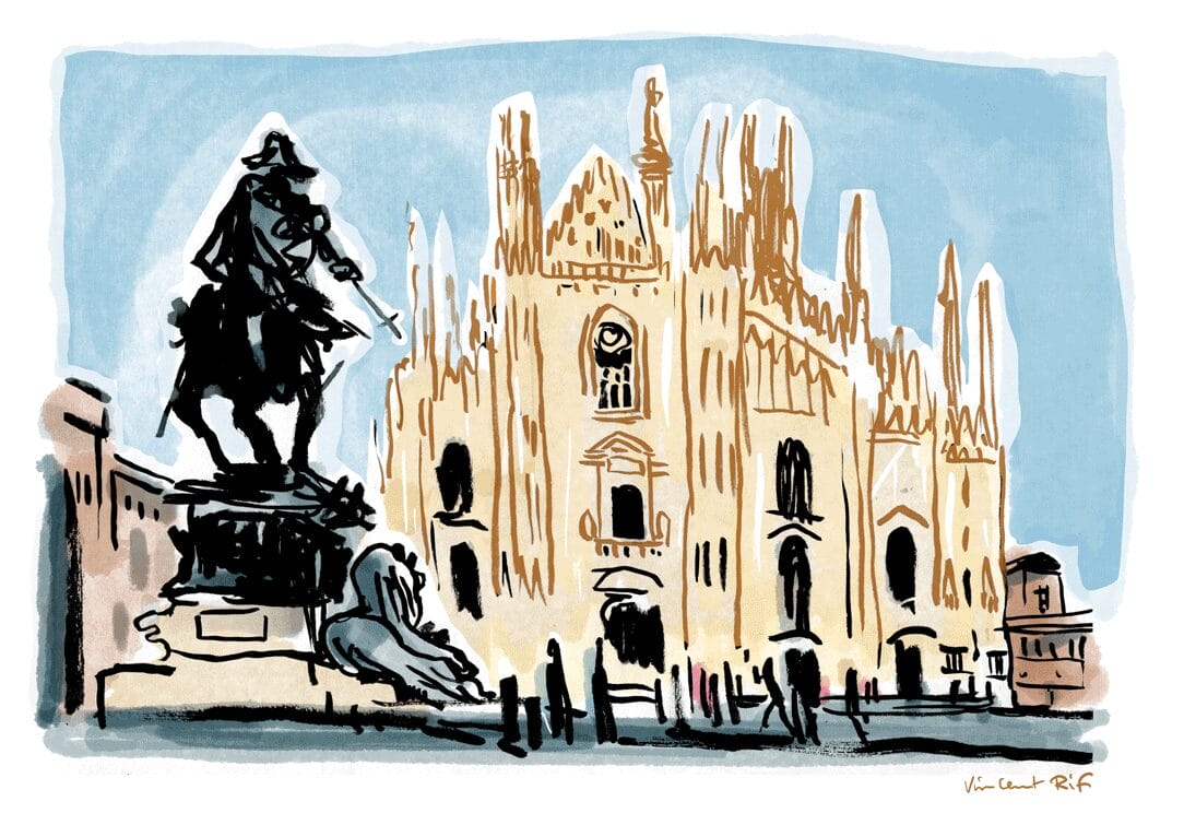 Juillet 2021, petit séjour à Milan. Voir le Duomo, un joyau de l’art gothique. Sur la même piazza del Duomo, avoir le tourni dans le museo del Novecento, le musée d’art contemporain de Milan. Flaner dans les jolies rues piétonnes. ne pas rater les puces dans le quartier des Navigli, au sud de la ville, où fleurissent restos, cafés, aperitivo et boutiques d’antiquité. Visiter la villa Necchi, la plus belle villa de Milan (du monde ?) ! Suivre les traces de Léonard Da Vinci, voir des maquettes de ses machine de guerre. Faire une rencontre du quatrième type avec le carton de l’école d’Athènes de Raphael. Déambuler dans le quartier de la mode, visiter la Fondation Armani, pavaner dans le magnifique corso Vittorio Emanuele II, derrière le Duomo. Et surtout dessiner cette belle ville d’Italie, luxueuse et raffinée.