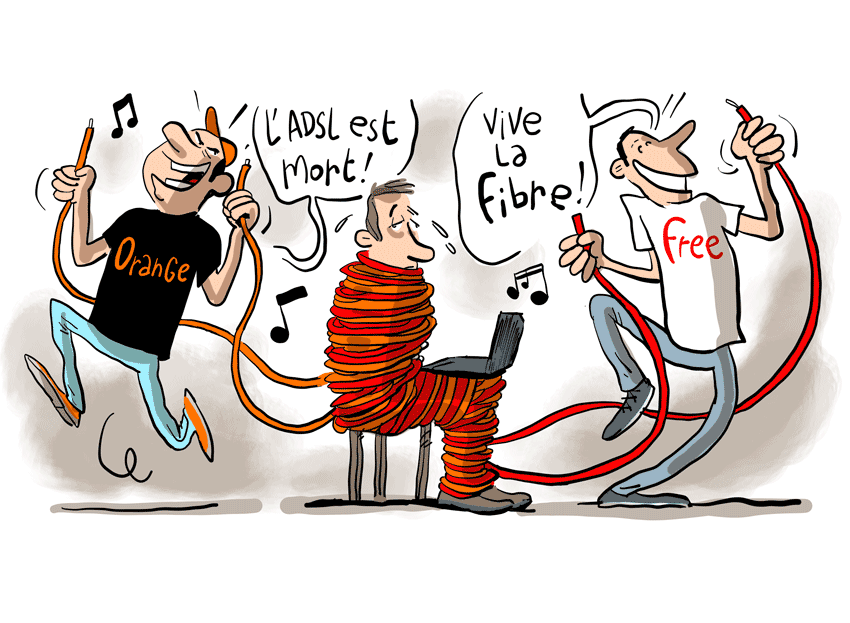 Fibre ou ADSL ? Les opéateurs Orange et Free forcent le consommateur à prendre la fibre. Illustration pour la magazine Que Choisir de février 2020.