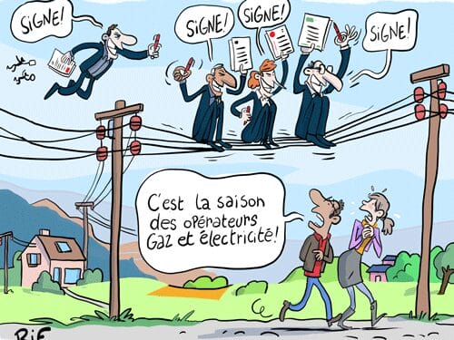 Le harcèlement des vendeurs de contrats des opérateurs d’électricité – dessin d’humour de Vincent Rif pour le magazine Que choisir