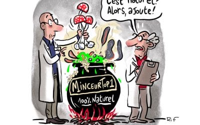 Est-ce que l’ajout d’éléments strictement naturels dans un médicament garantit un médicament entièrement sûr et sain ? Illustration de Vincent Rif pour le magazine Que Choisir Santé de septembre 2021.