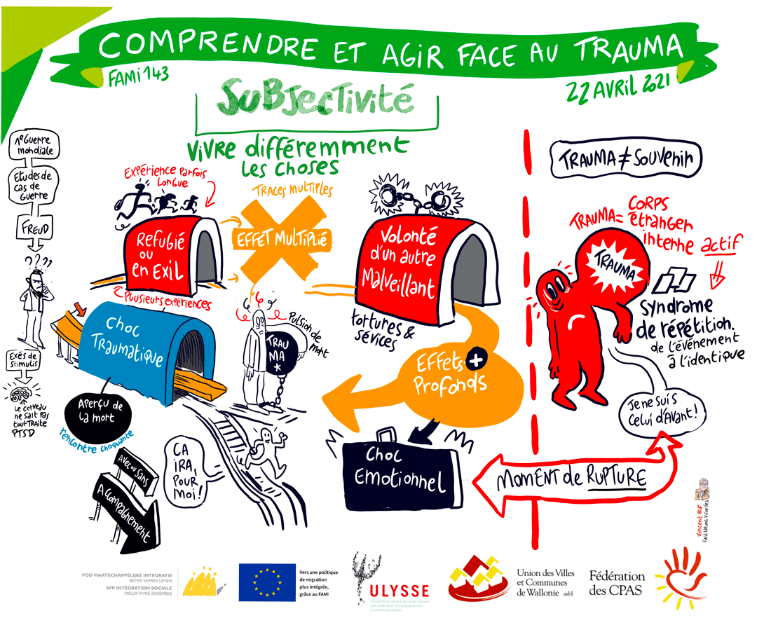 En voici quelques planches de facilitation visuelle que j’ai produites en direct durant la formation « Comprendre et agir face au trauma, organisée par le Centre de la Fédération des CPAS de l’Union des CPAS et l’Union des Villes et Communes de Wallonie. Formation donnée par Pascale de Ridder, professeur invité à l’ULB en psychothérapie psychanalytique et psychothérapeute pour l’asbl Ulysse. Ulysse est un service de santé mentale belge spécialisé dans l’accompagnement de personnes exilées.