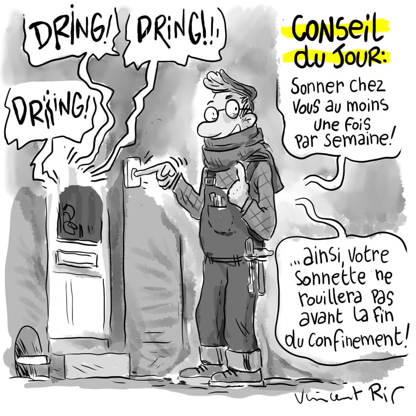 Petit conseil utile pour les sonnettes en confinememt. Dessin extrait d’un carnet d’illustration sur le COVID-19.