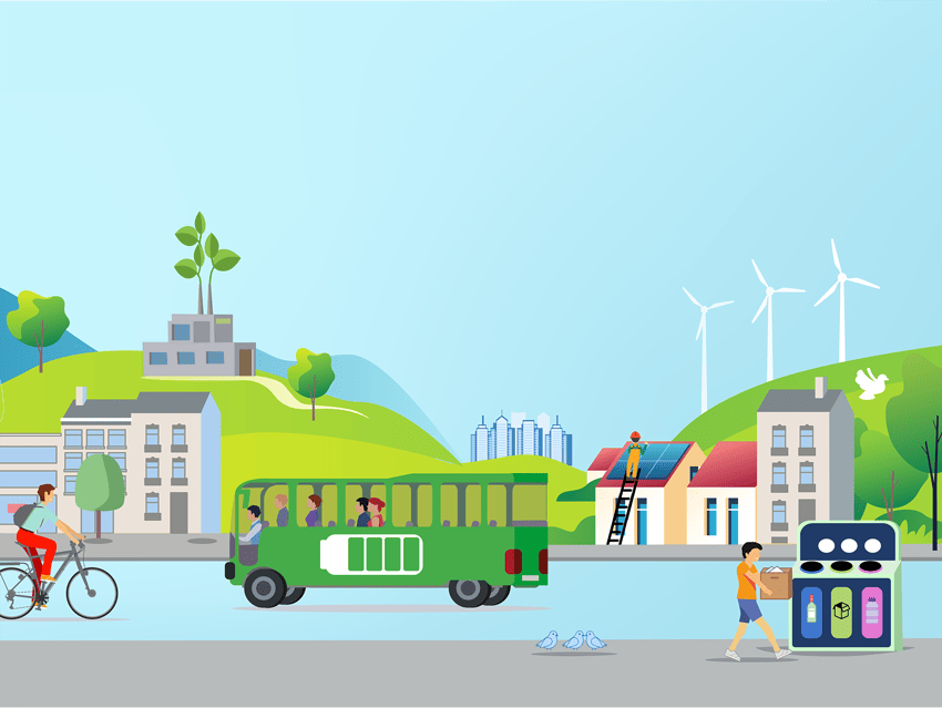 Illustration about Decarbonisation (recycling, biking, solar energy, eolian energy, electric cars, bus, train, trees, …). For the Community Research and Development Information Service (CORDIS). It is the European Commission’s primary source of results from the projects funded by the EU’s framework programmes for research and innovation. The illustration will be the cover of the magazine of Cordis of july 2020 and a postcard published in European Commission’s 27 languages.