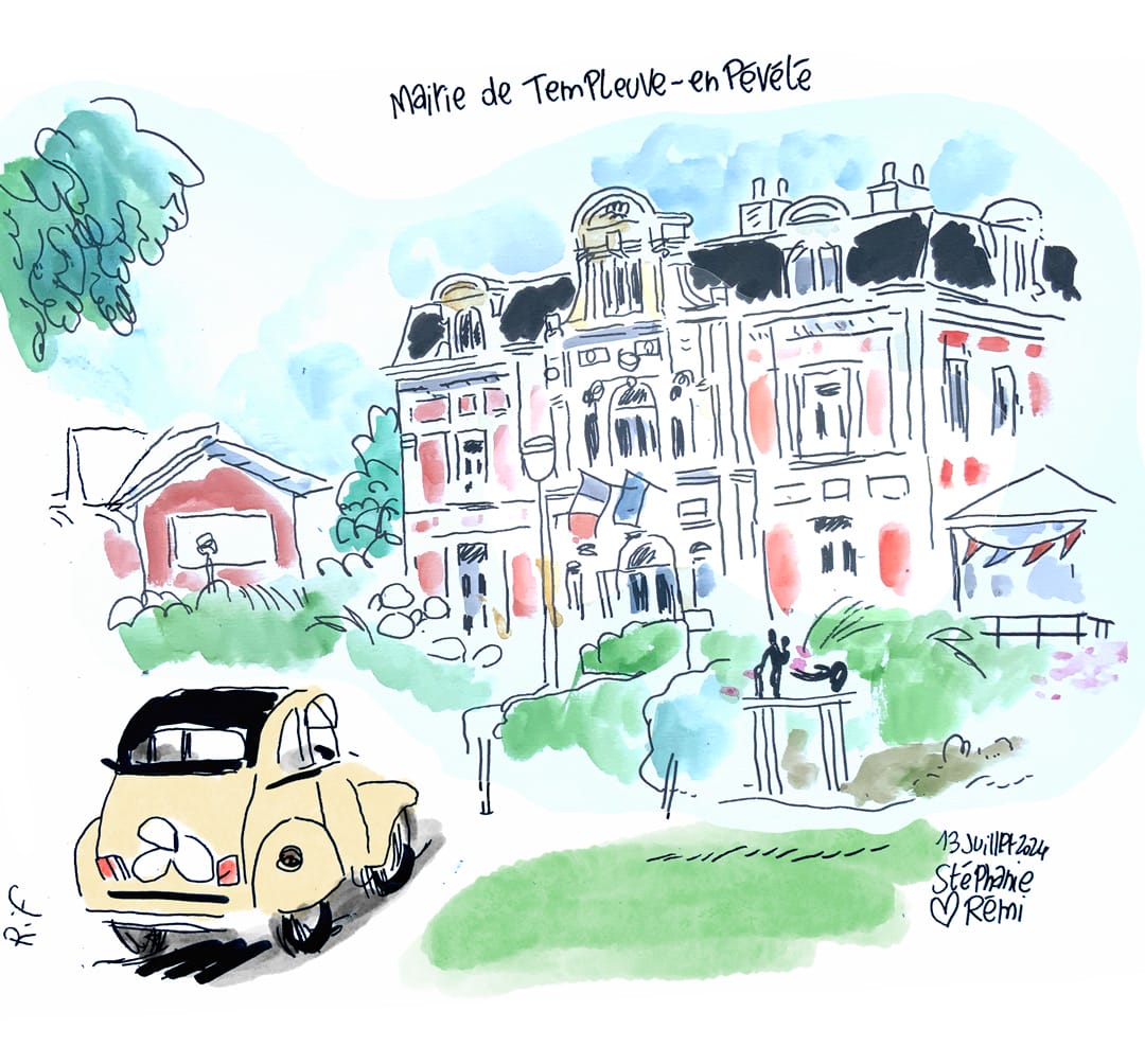 Les dessins de mariage sont réalisés sur papier d’art. Avec une touche d’aquarelle. Possibilités de réalisation sur iPad avec impression et/ou avec projections. Paris, Picardie, Normandie, Namur, Haute-Savoie, Sarthe, Bretagne, Brabant wallon, Lorraine, Provence, Occitanie, Normandie, Namur, Pays de la Loire, etc. Je me déplace dans toute la France et toute la Belgique. J’habite Bruxelles, non loin de la gare TGV et de l’aéroport. J’ai aussi une voiture et un vélo électrique pliable.