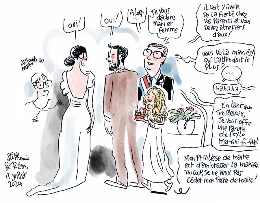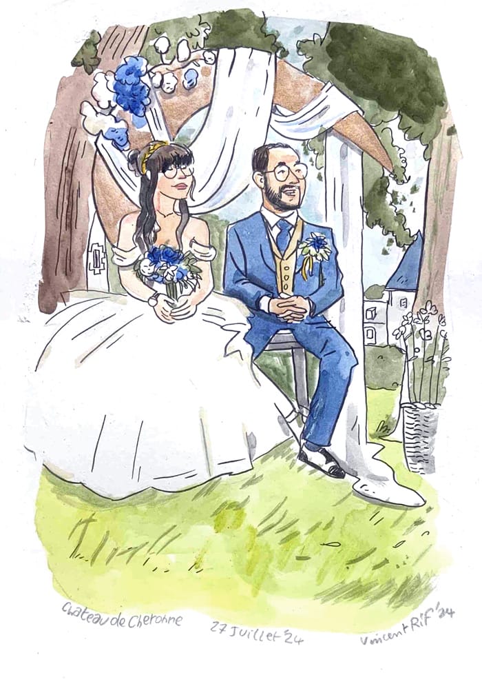Le jour du mariage, je réalise un reportage dessiné complet, avec la possibilité de mettre en place un « bar à portraits ». C’est un stand (une table décorée et deux chaises) pour faire les portraits des invités (pendant le vin d’honneur, le repas et la partie dansante). Sur papier ou en numérique (j’apporte mon imprimante portable couleur).
