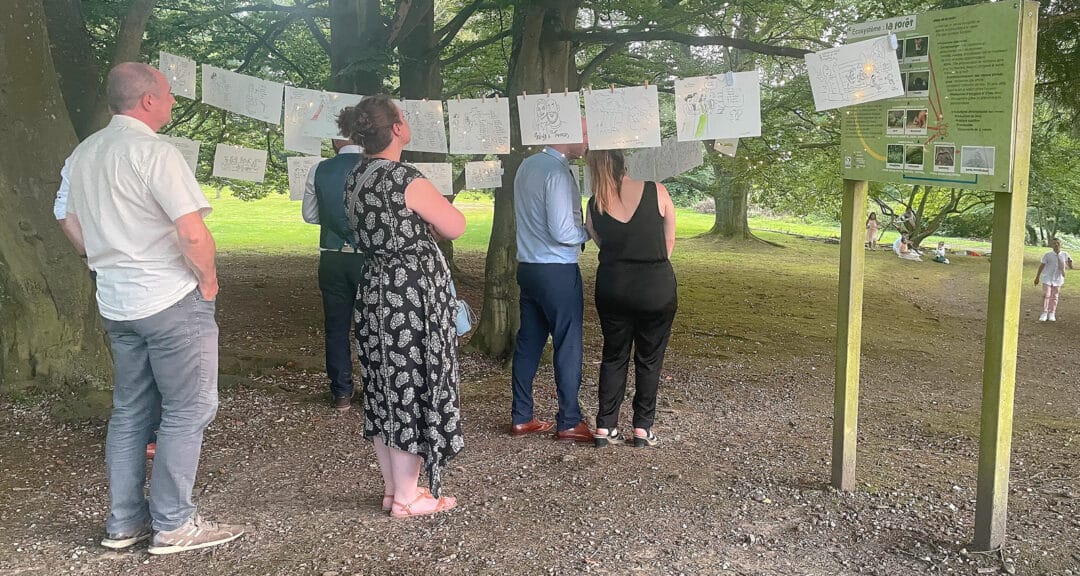 Si je viens en voiture, j’apporte un chevalet et un cadre en bois dans lesquels je peux rapidement exposer les dessins réalisés. Soit à l’extérieur ou à l’intérieur. Cela évite d’abimer les murs de la salle louée et de déplacer facilement l’exposition de dessin.