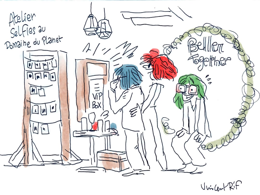 Les dessins sur du papier d’art sont accrochés sur un fil dans un lieu de passage et des guirlandes de lampes LED. J’accroche ce fil entre les arbres, les palmiers du domaine ou sur les murs extérieurs du château. Cela constitue une exposition en direct et un journal de la journée. Les invités vont les voir régulièrement pour découvrir « les nouveaux dessins ».