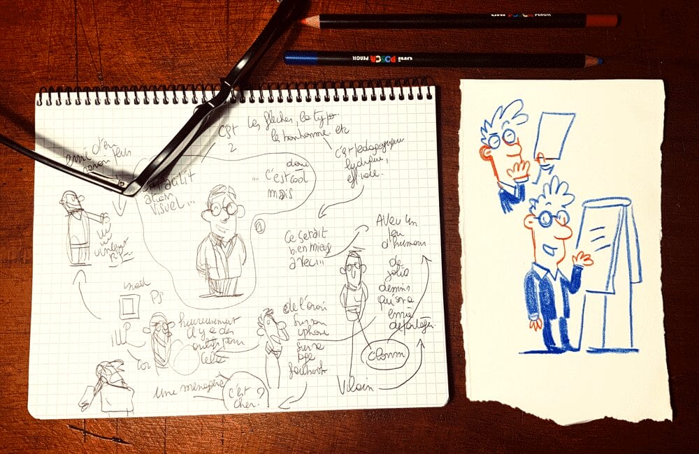 Un brouillon du déroulement de la séquence vidéo est fait sur papier avec feutres et crayons de couleur Posca. Cette recherche graphique permet aussi de trouver le ou les personnages principaux de la séquence.