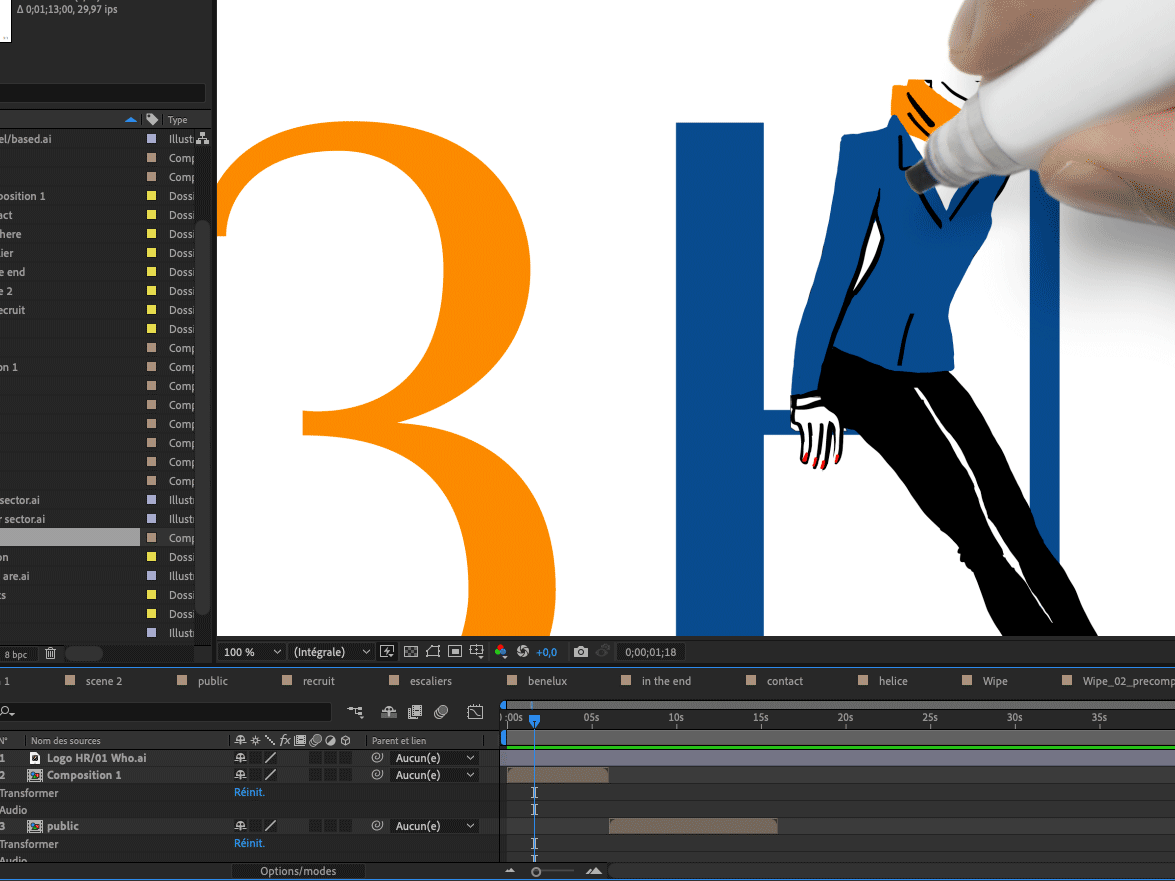 Pour le montage, j’utilse les logiciels Adobe After Effects et Adobe Premiere (l’exemple ci-dessus a été fait par VideoScribe, logiciel que je trouve trop limité).