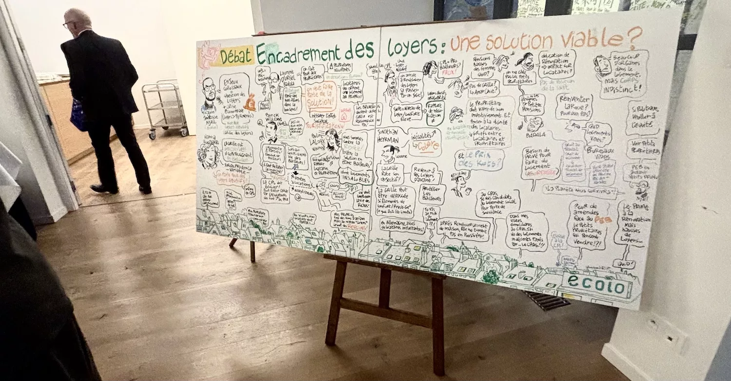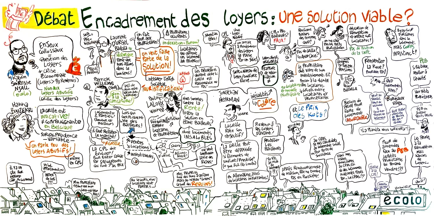 Ci-dessous, une facilitation graphique peinte sur toile de 2 m de long sur un mètre de hauteur sur châssis et avec Posca au Parlement bruxellois. Accompagnement d’un débat sur aux conditions d’accès au logement bruxellois (location, achat, coopératives, évolution du marché). Cette fresque retrace les six exposés d’une table ronde (Partie gauche) et les questions/réponses du public (partie de droite). De la partie basse, des phylactères permettent de retracer les interactions opportunes de la salle. Cet outil réalisé en direct implique les personnes présentes (orateurs, public et organisateur) et augmente la participation (être présent dans la fresque). C’est aussi un outil pour le modérateur. La fresque est affichée dans les locaux d’Ecolo et devient une trace concrète du débat. Je résume oralement la fresque en fin de discussion avant la conclusion de la journée. Elle reste exhibée lors du drink de fin et permet aux invités de faire des selfies « avec les propos du jour » et de rebondir sur le contenu de la journée.