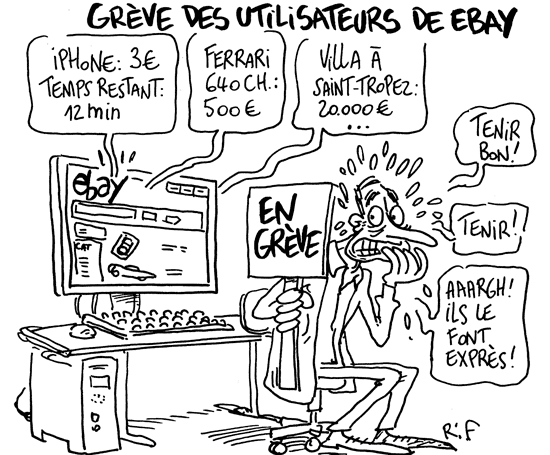 Grève des utilisateurs de Ebay 21 Fév 2008 | Dessin de presse, Économie, Illustrations pour L'Echo Grève mondiale sur eBay. Acheteurs et vendeurs boycottent le site de ventes aux enchères du 18 au 25 février. Ils protestent ainsi contre les nouvelles mesures annoncées par la direction d’eBay. Dessin pour le quotidien l’Echo.