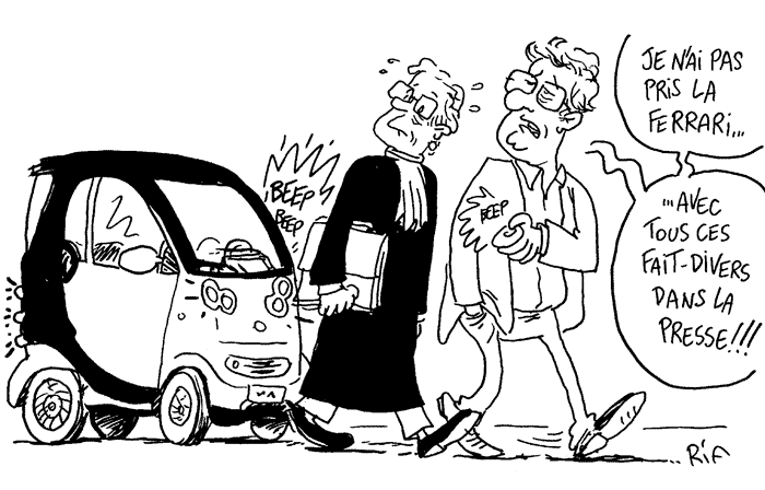 C’est en Smart que le Prince Laurent, pourtant collectionneur de voitures de sport (En 1999, il a acheté trois Ferrari le même jour chez un concessionnaire), s’est rendu au tribunal correctionnel de Hasselt pour témoigner dans le cadre du procès sur les fraudes à la Marine. Dessin pour l’Echo.