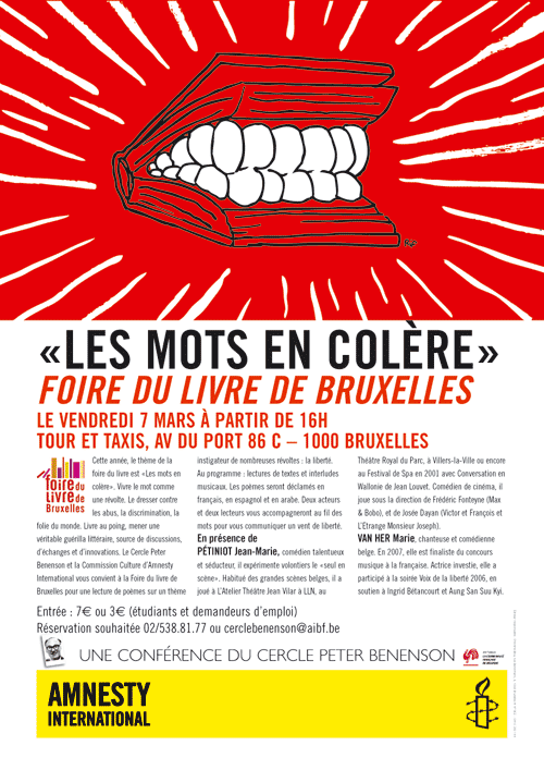 Les mots en colère 29 Fév 2008 | Blog, Le dessin, outil de communication Affiche pour une conférence d’Amnesty International lors de la Foire du Livre de Bruxelles.
