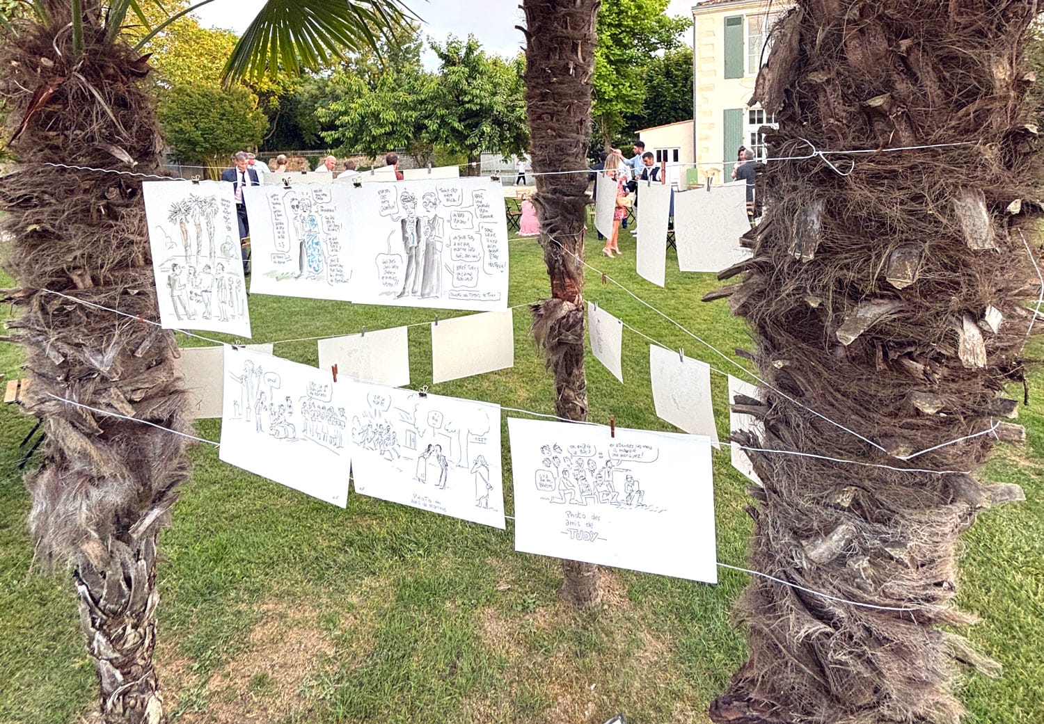 Je demande au marié s’il souhaite un dessin en particulier. « Oui. Je reviens vers toi dans une heure pour t’expliquer ce que j’aimerai avoir comme dessin. » Une heure plus tard, Tudy m’expliue qu’il aimerait avoir une planche de BD. Une demi-heure après…