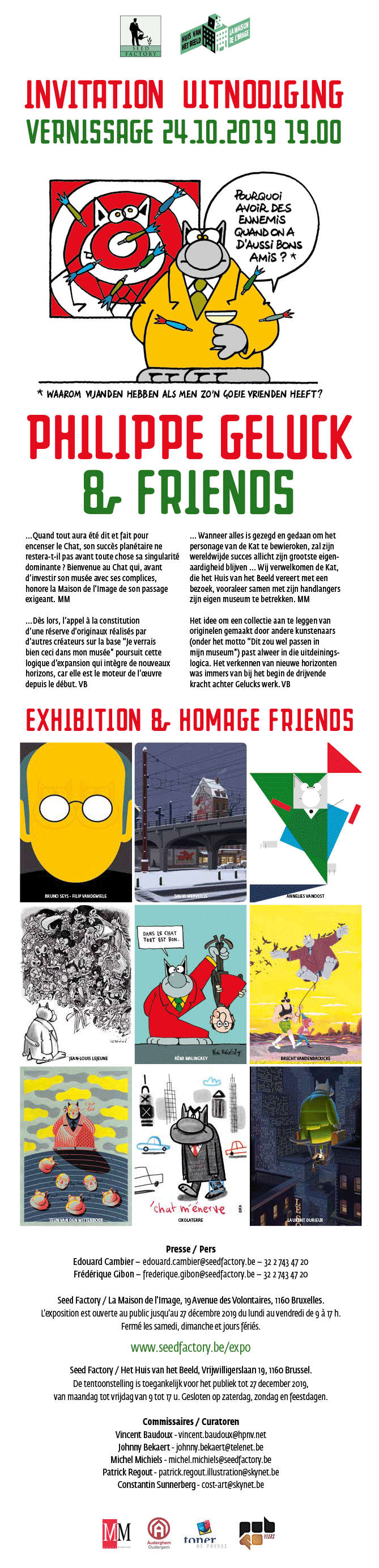 Les 2 autres niveaux de la Seed Factory présenteront les hommages du who’s who des créateurs invités par Philippe Geluck et la Maison de l’image. Les originaux des oeuvres présentées à la Maison de l’Image pourront éventuellement faire partie des collections du prochain musée Le Chat / Philippe Geluck qui s’érigera à deux pas du musée Magritte à Bruxelles.