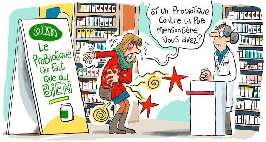 Probiotiques, toujours parfaits ? 15 Fév 2020 | Dessin de presse, Illustrations pour le mensuel Que Choisir, Santé Illustration sur les publicités pour les probiotiques pour le courrier des lecteurs du magazine Que Choisir de février 2020.