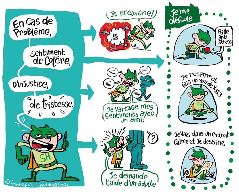 Réagir face à la violence à l’école 30 Mai 2019 | Facilitations graphiques, Jeunesse Guide visuel pour aider les enfants d’une école à réagir face à la violence. Client : Ecole Saint-Henri de Woluwe-Saint-Lambert (Bruxelles). Date : avril 2019.