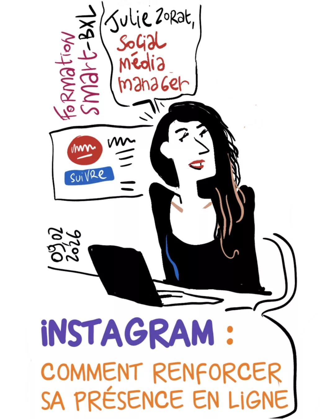 Réaliseation d’une facilitation graphique lors d’une formation animée par Julie Zorat, Social Media Manager, à la Smart. Le thème : renforcer sa présence en ligne sur Instagram, avec des conseils pratiques pour freelances et créatifs.