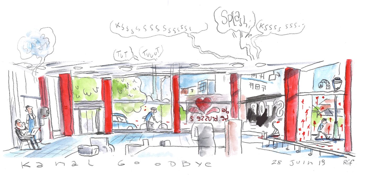 Le 28 juin 2019. Dessins au feutre, crayon et aquarelles. Dans le cadre de la fermeture de Kanal Pompidou pour travaux. A l’initiative de Françoise Pendville.